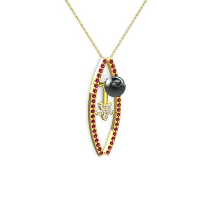 Siyah inci, rodolit garnet ve pırlanta 18 ayar altın kolye (0.066 karat, 40 cm altın rolo zincir)