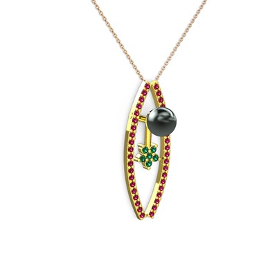 Siyah inci, rodolit garnet ve yeşil kuvars 18 ayar altın kolye (40 cm rose altın rolo zincir)