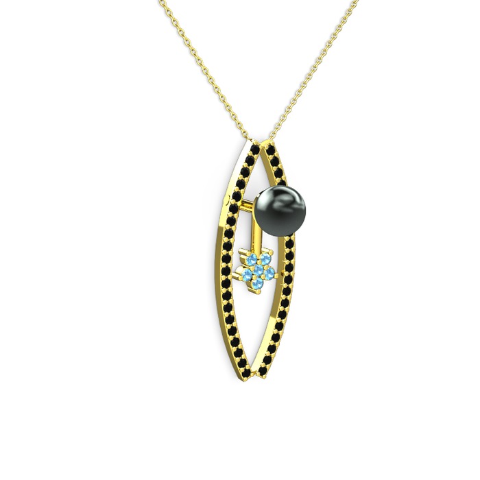 Siyah inci, siyah zirkon ve akuamarin 8 ayar altın kolye (40 cm gümüş rolo zincir)
