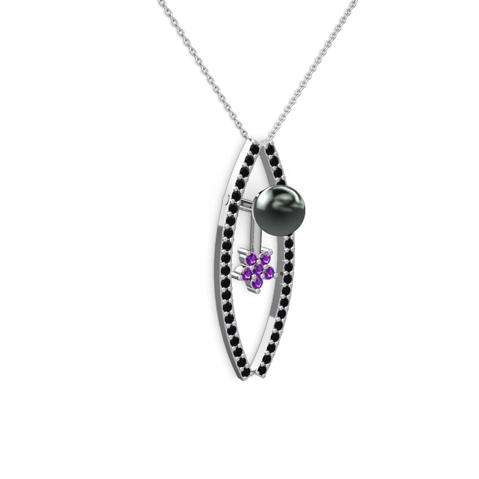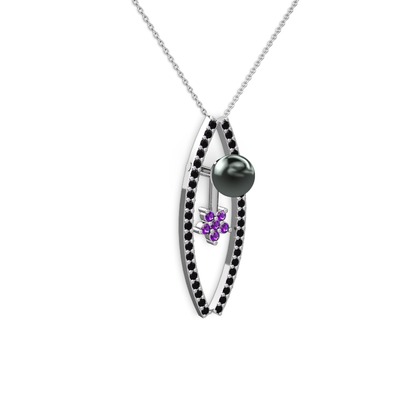 Siyah inci, siyah zirkon ve ametist 8 ayar beyaz altın kolye (40 cm beyaz altın rolo zincir)