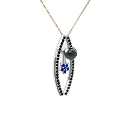 Siyah inci, siyah zirkon ve lab safir 8 ayar beyaz altın kolye (40 cm rose altın rolo zincir)