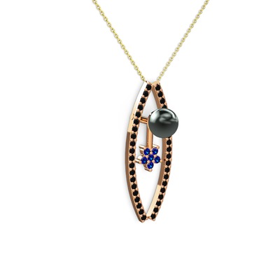 Siyah inci, siyah zirkon ve lab safir 8 ayar rose altın kolye (40 cm altın rolo zincir)