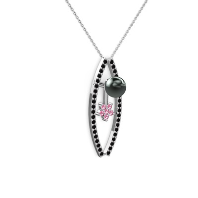 Siyah inci, siyah zirkon ve pembe kuvars 8 ayar beyaz altın kolye (40 cm beyaz altın rolo zincir)