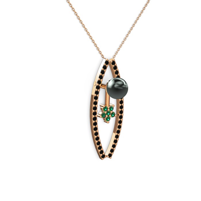 Siyah inci, siyah zirkon ve yeşil kuvars 8 ayar rose altın kolye (40 cm rose altın rolo zincir)