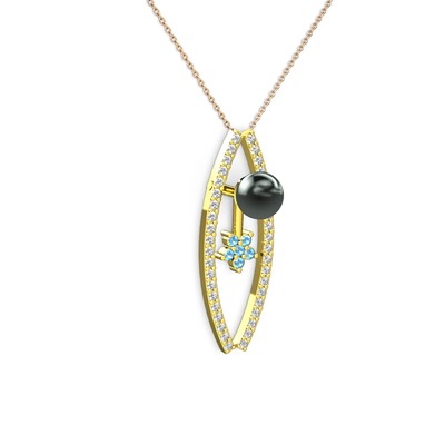 Siyah inci, swarovski ve akuamarin 925 ayar altın kaplama gümüş kolye (40 cm rose altın rolo zincir)