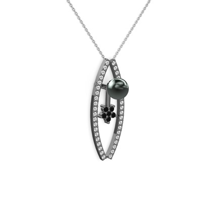 Siyah inci, swarovski ve siyah zirkon 925 ayar siyah rodyum kaplama gümüş kolye (40 cm beyaz altın rolo zincir)