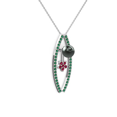 Siyah inci, yeşil kuvars ve rodolit garnet 925 ayar gümüş kolye (40 cm beyaz altın rolo zincir)