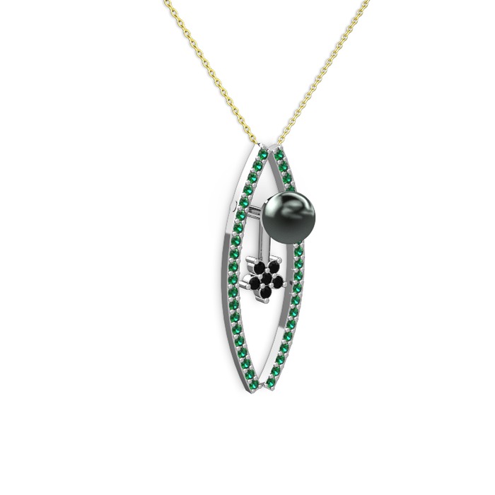Siyah inci, yeşil kuvars ve siyah zirkon 14 ayar beyaz altın kolye (40 cm altın rolo zincir)