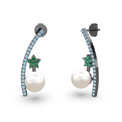 Inci, akuamarin ve yeşil kuvars 925 ayar siyah rodyum kaplama gümüş küpe