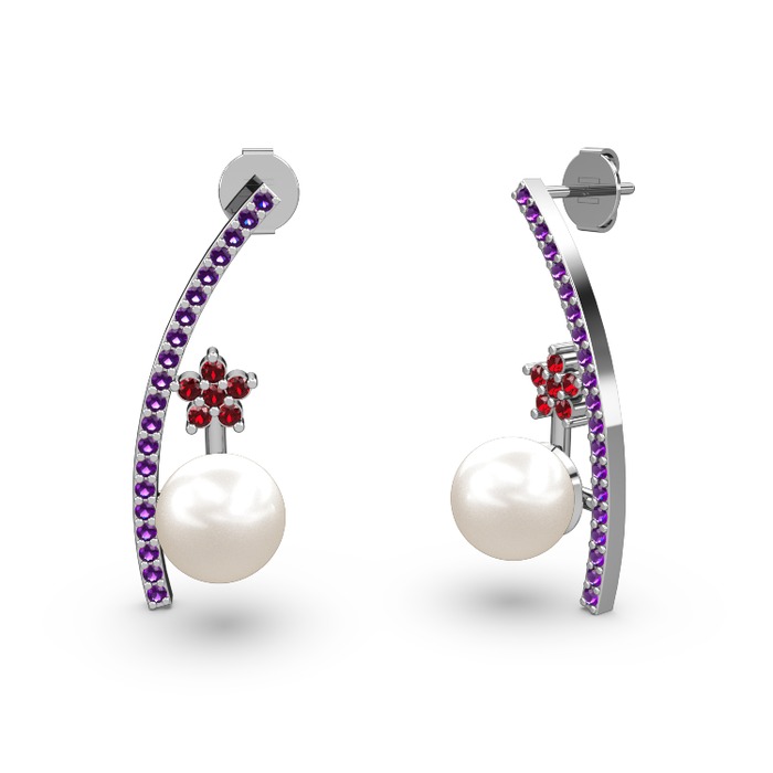 Inci, ametist ve garnet 18 ayar beyaz altın küpe