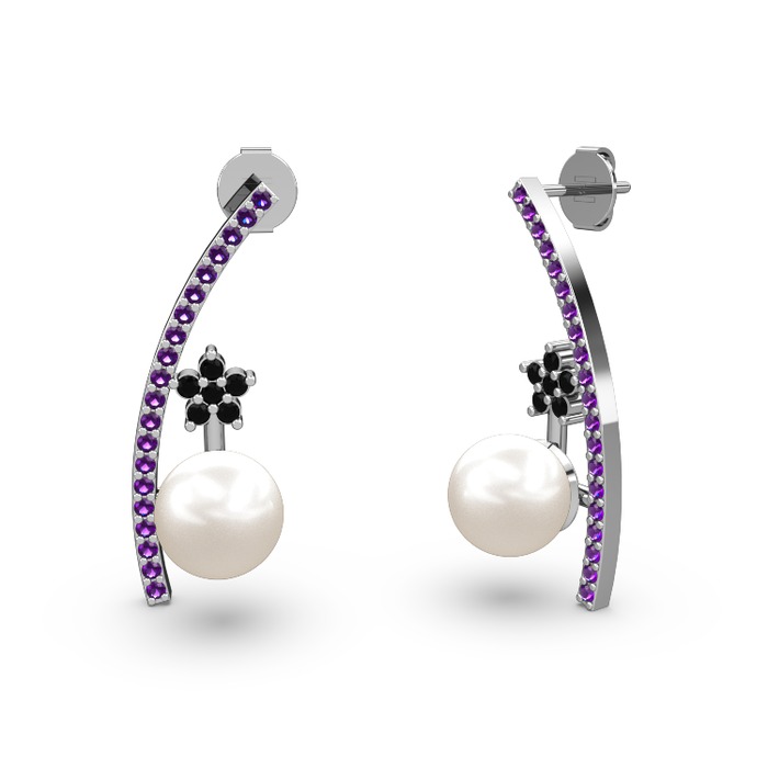 Inci, ametist ve siyah zirkon 8 ayar beyaz altın küpe