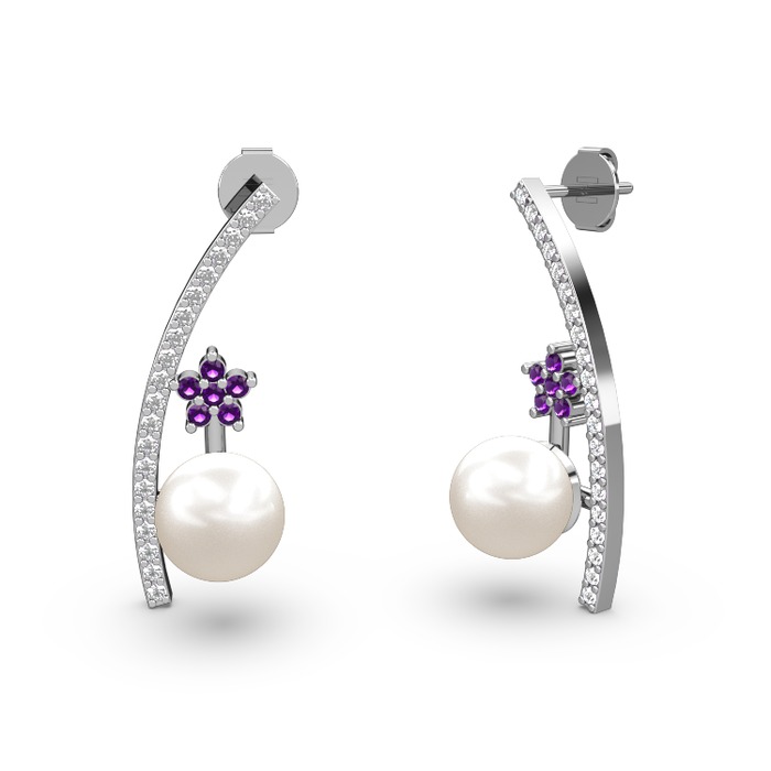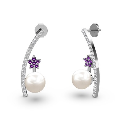 Inci, beyaz zirkon ve ametist 18 ayar beyaz altın küpe