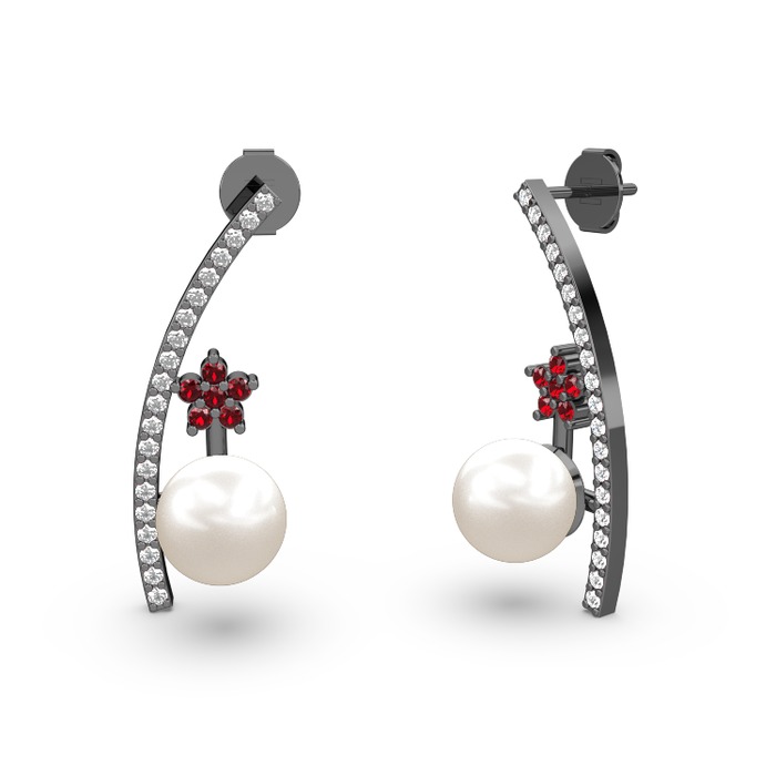 Inci, beyaz zirkon ve garnet 925 ayar siyah rodyum kaplama gümüş küpe