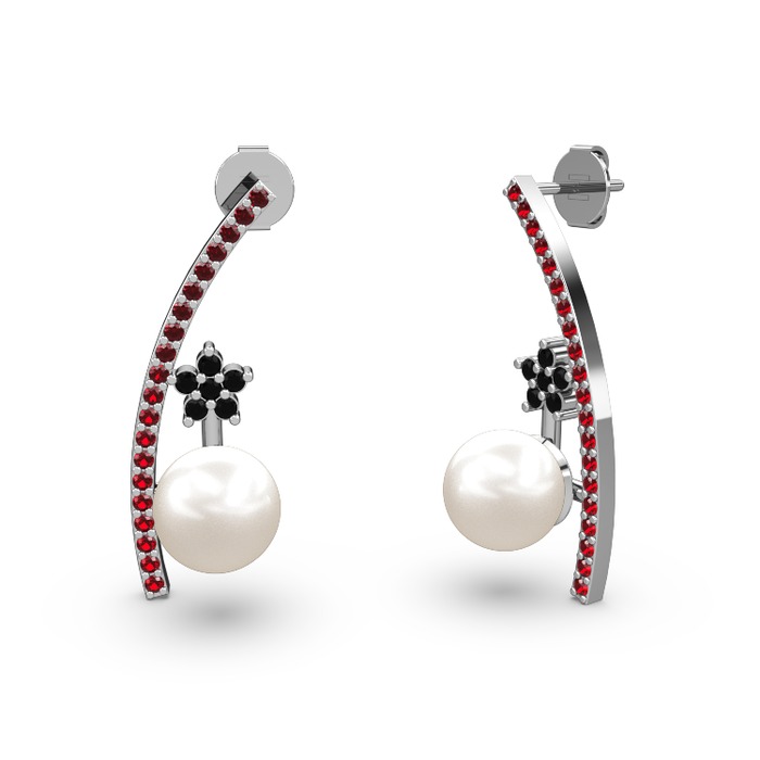 Inci, garnet ve siyah zirkon 8 ayar beyaz altın küpe