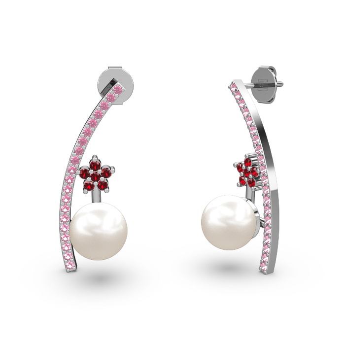 Inci, pembe kuvars ve garnet 8 ayar beyaz altın küpe