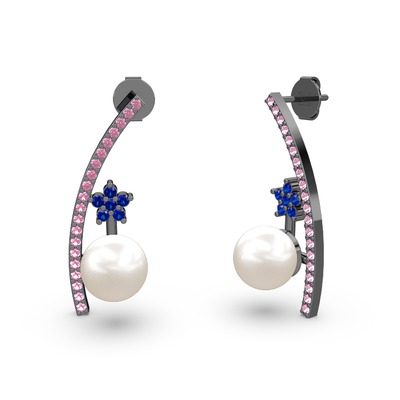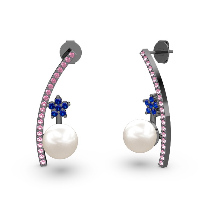 Inci, pembe kuvars ve lab safir 925 ayar siyah rodyum kaplama gümüş küpe
