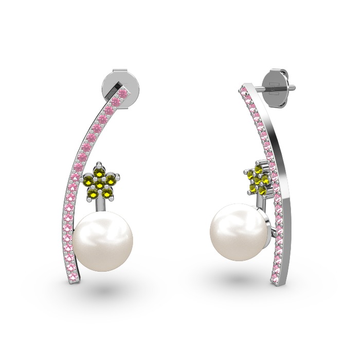 Inci, pembe kuvars ve peridot 14 ayar beyaz altın küpe