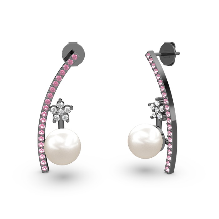 Inci, pembe kuvars ve swarovski 925 ayar siyah rodyum kaplama gümüş küpe