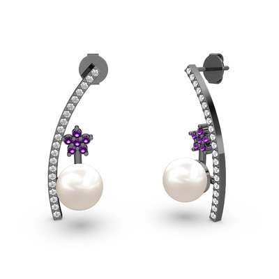 Inci, swarovski ve ametist 925 ayar siyah rodyum kaplama gümüş küpe
