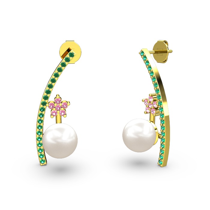 Inci, yeşil kuvars ve pembe kuvars 18 ayar altın küpe