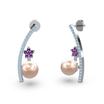 Pembe inci, akuamarin ve ametist 8 ayar beyaz altın küpe