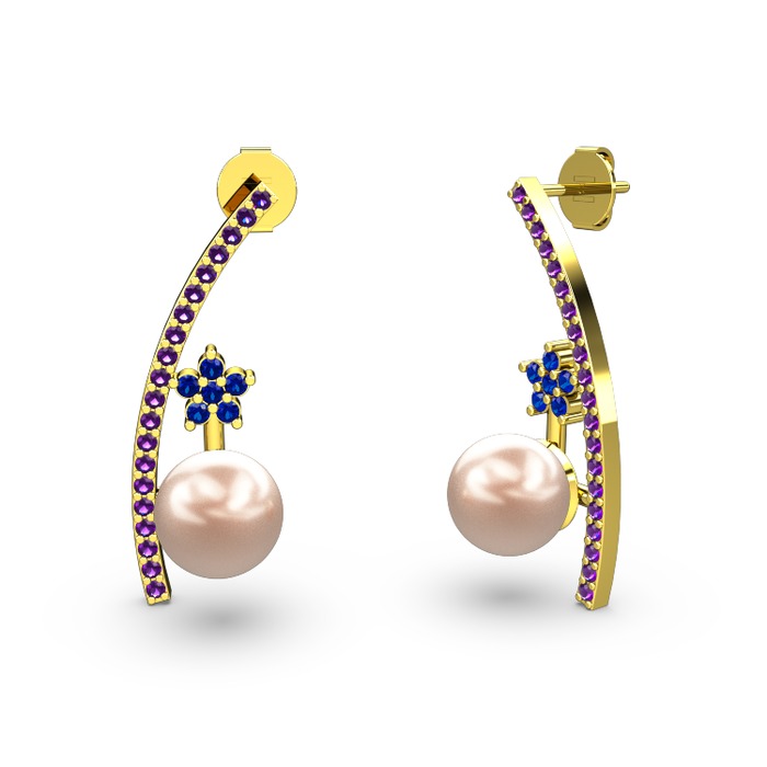 Pembe inci, ametist ve lab safir 14 ayar altın küpe