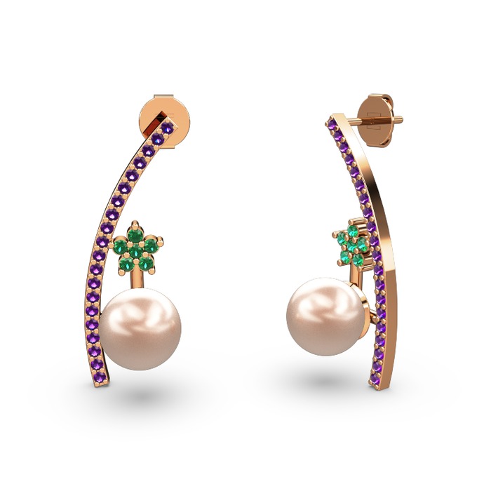 Pembe inci, ametist ve yeşil kuvars 8 ayar rose altın küpe