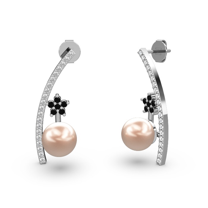Pembe inci, beyaz zirkon ve siyah zirkon 8 ayar beyaz altın küpe
