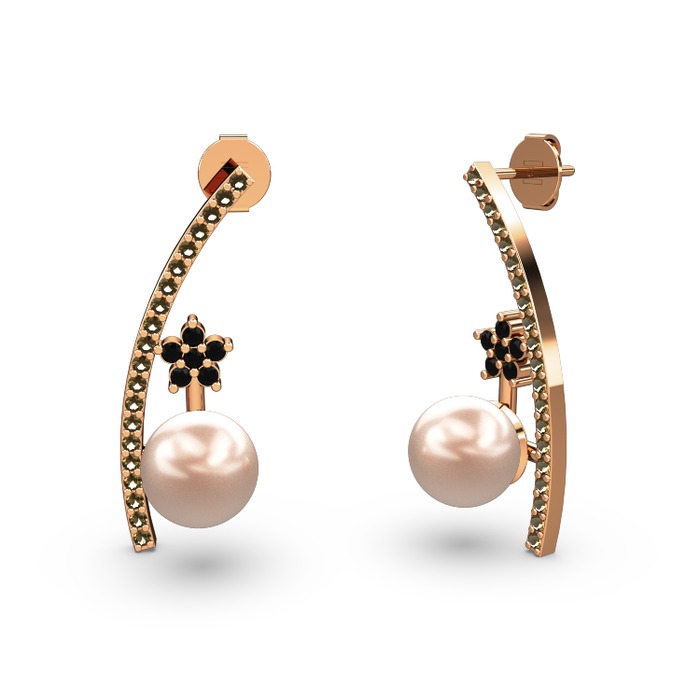 Pembe inci, dumanlı kuvars ve siyah zirkon 18 ayar rose altın küpe