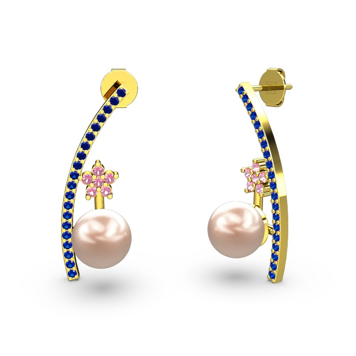 Pembe inci, lab safir ve pembe kuvars 18 ayar altın küpe