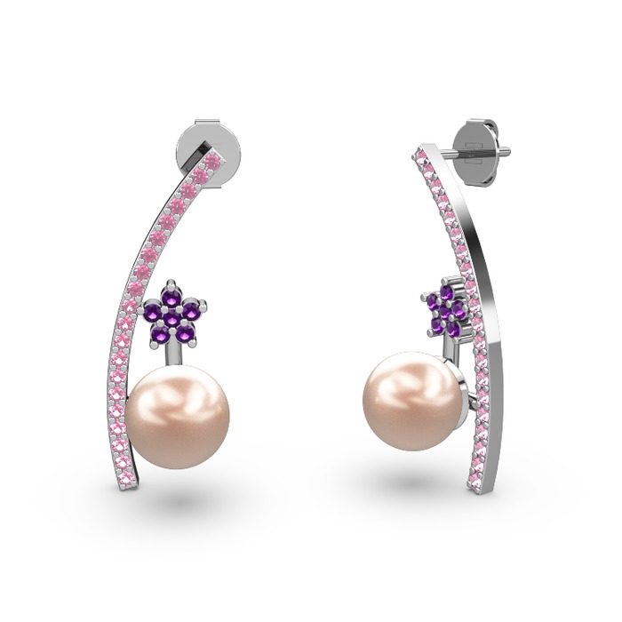 Pembe inci, pembe kuvars ve ametist 18 ayar beyaz altın küpe