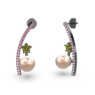 Pembe inci, pembe kuvars ve peridot 925 ayar siyah rodyum kaplama gümüş küpe