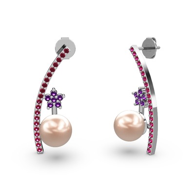 Pembe inci, rodolit garnet ve ametist 18 ayar beyaz altın küpe