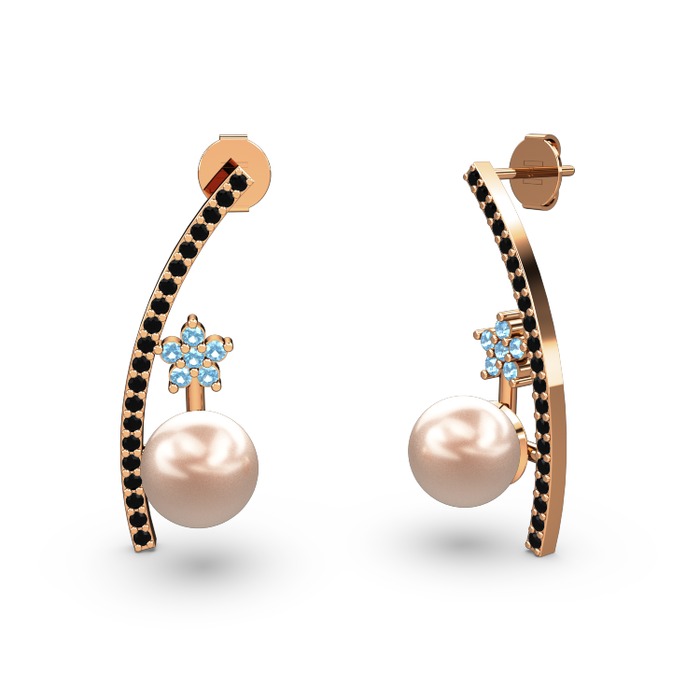 Pembe inci, siyah zirkon ve akuamarin 8 ayar rose altın küpe