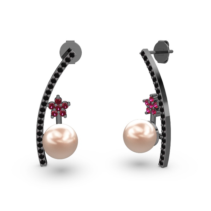 Pembe inci, siyah zirkon ve rodolit garnet 925 ayar siyah rodyum kaplama gümüş küpe