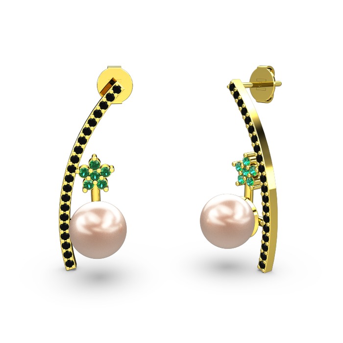 Pembe inci, siyah zirkon ve yeşil kuvars 14 ayar altın küpe