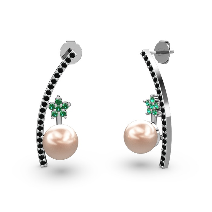 Pembe inci, siyah zirkon ve yeşil kuvars 8 ayar beyaz altın küpe