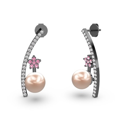 Pembe inci, swarovski ve pembe kuvars 925 ayar siyah rodyum kaplama gümüş küpe
