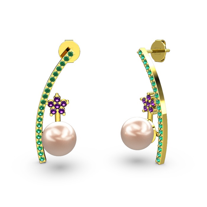 Pembe inci, yeşil kuvars ve ametist 14 ayar altın küpe