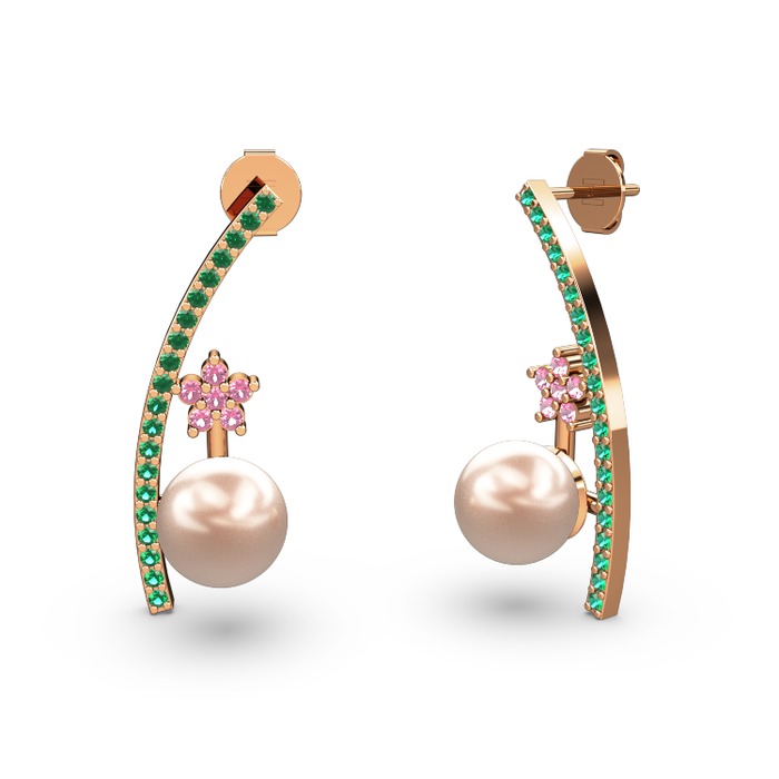 Pembe inci, yeşil kuvars ve pembe kuvars 18 ayar rose altın küpe