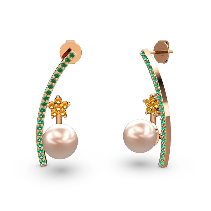Pembe inci, yeşil kuvars ve sitrin 14 ayar rose altın küpe