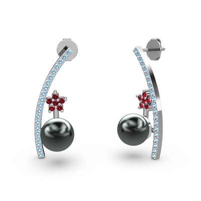 Siyah inci, akuamarin ve garnet 18 ayar beyaz altın küpe