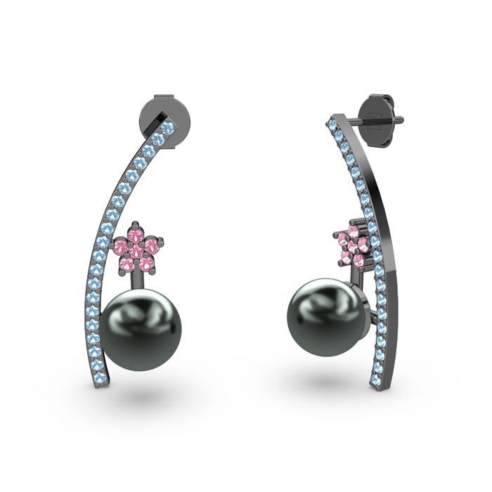 Siyah inci, akuamarin ve pembe kuvars 925 ayar siyah rodyum kaplama gümüş küpe