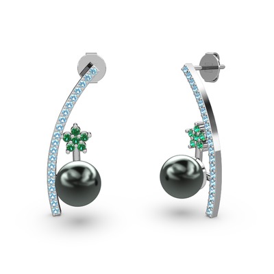 Siyah inci, akuamarin ve yeşil kuvars 14 ayar beyaz altın küpe