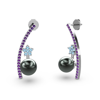 Siyah inci, ametist ve akuamarin 925 ayar gümüş küpe