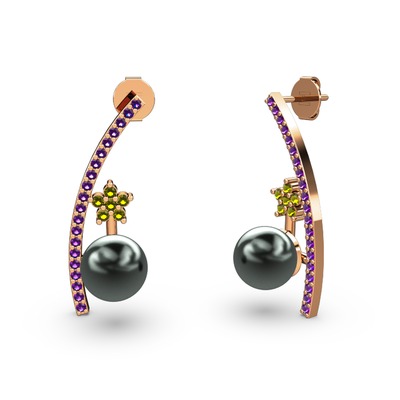 Siyah inci, ametist ve peridot 925 ayar rose altın kaplama gümüş küpe
