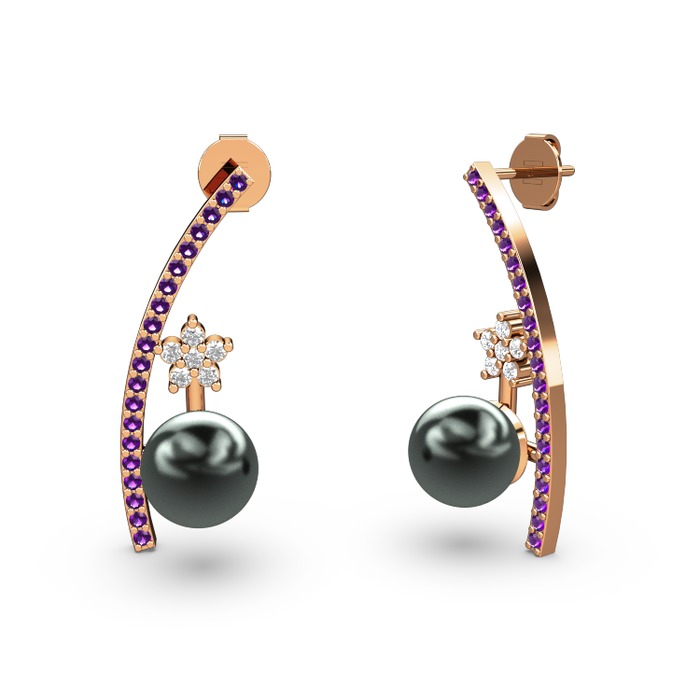 Siyah inci, ametist ve pırlanta 8 ayar rose altın küpe (0.44 karat)