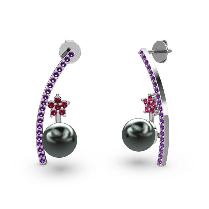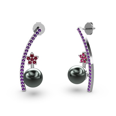 Siyah inci, ametist ve rodolit garnet 8 ayar beyaz altın küpe