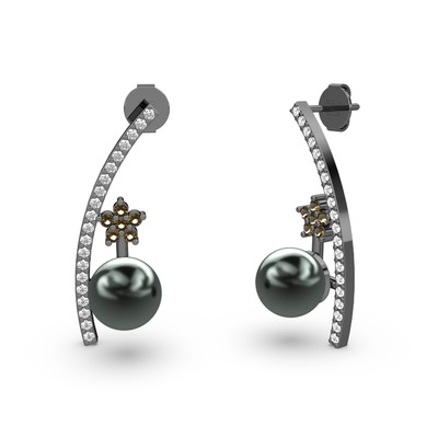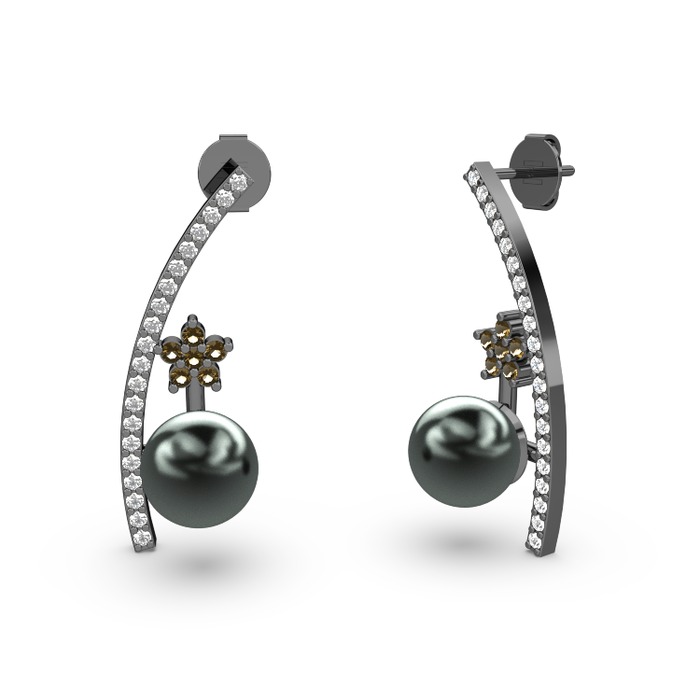 Siyah inci, beyaz zirkon ve dumanlı kuvars 925 ayar siyah rodyum kaplama gümüş küpe