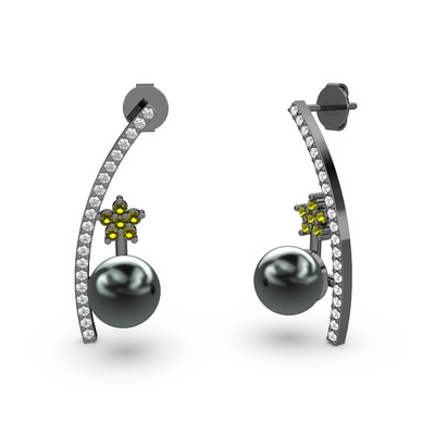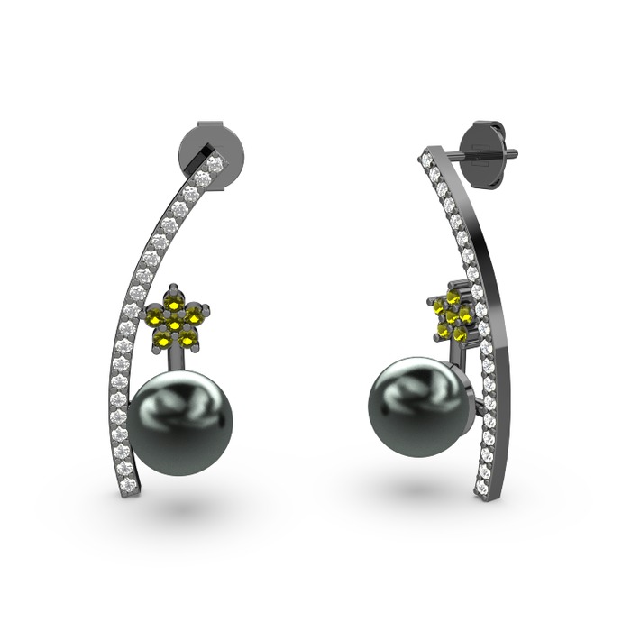 Siyah inci, beyaz zirkon ve peridot 925 ayar siyah rodyum kaplama gümüş küpe